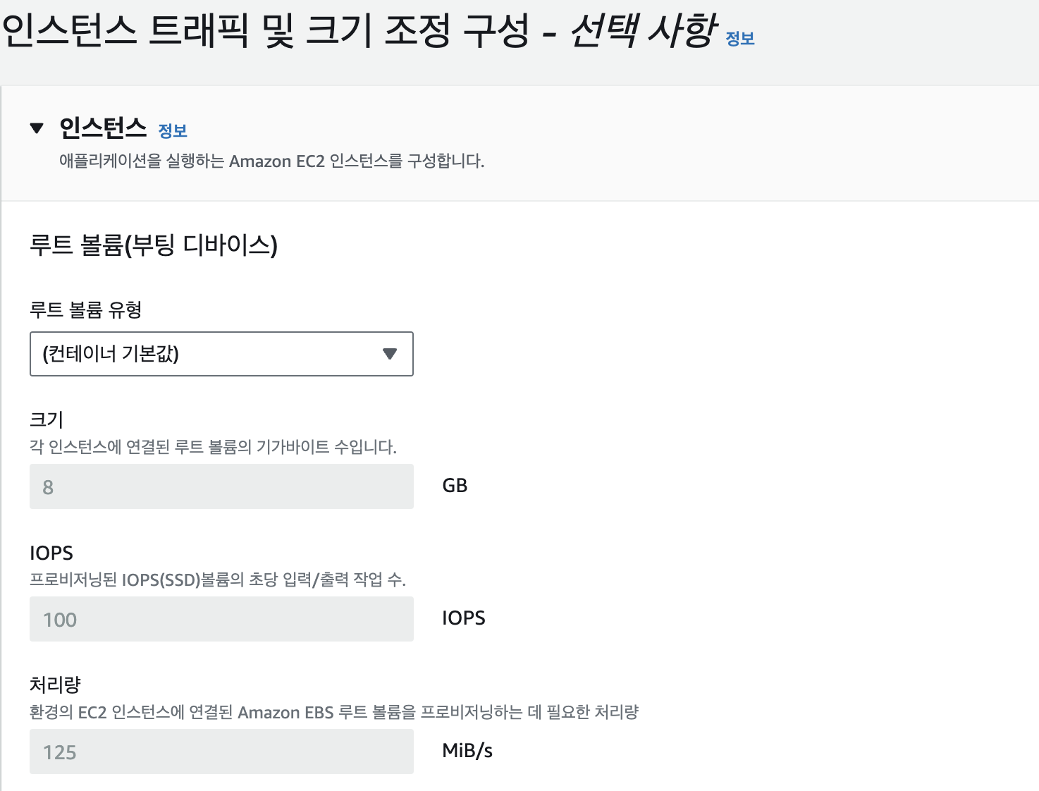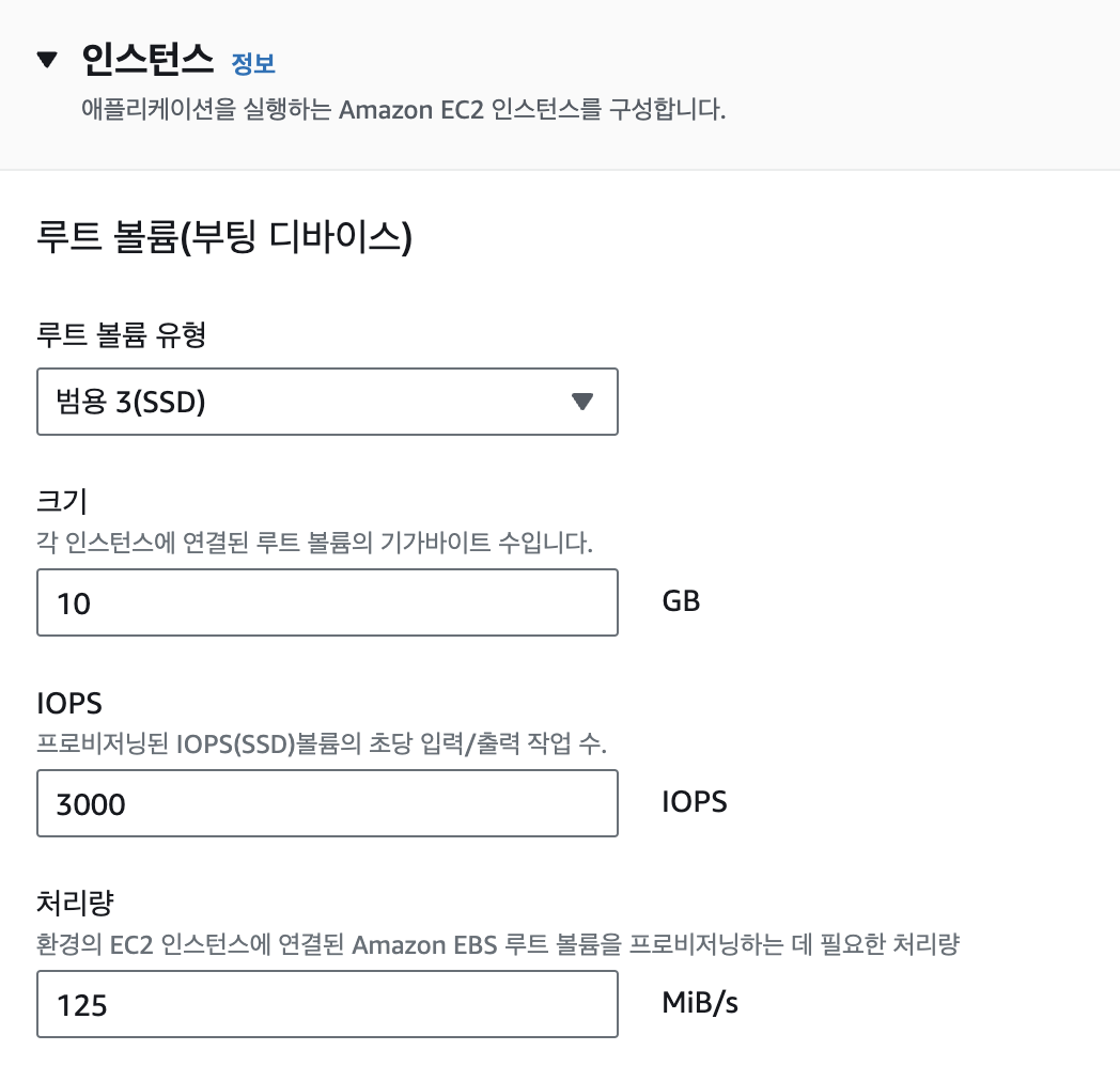앞선 사진에서 default 값으로 작성된 루트 볼륨을 gp3(범용 3)으로 수정해주시면 됩니다!