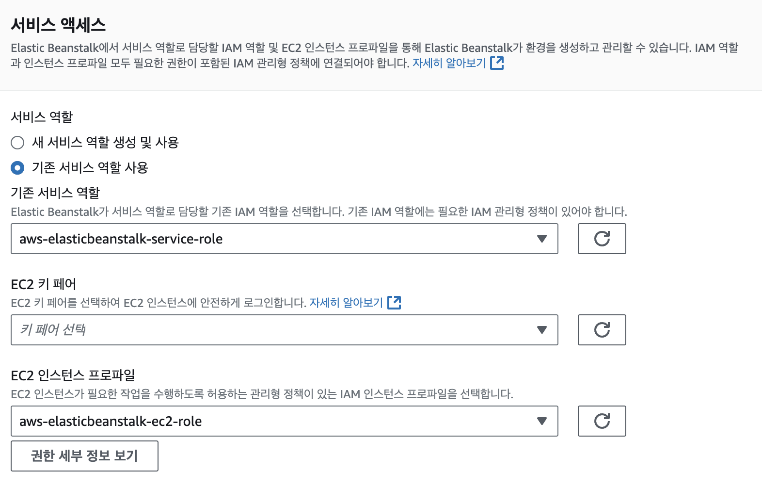 1단계 환경구성을 마친 후, 2단계 서비스 액세스 구성으로 넘어가게 된다면, EC2 인스턴스 프로파일에 기입 가능해야 할 [aws-elasticbeanstalk-ec2-role]이 보이지 않는 경우가 있습니다!