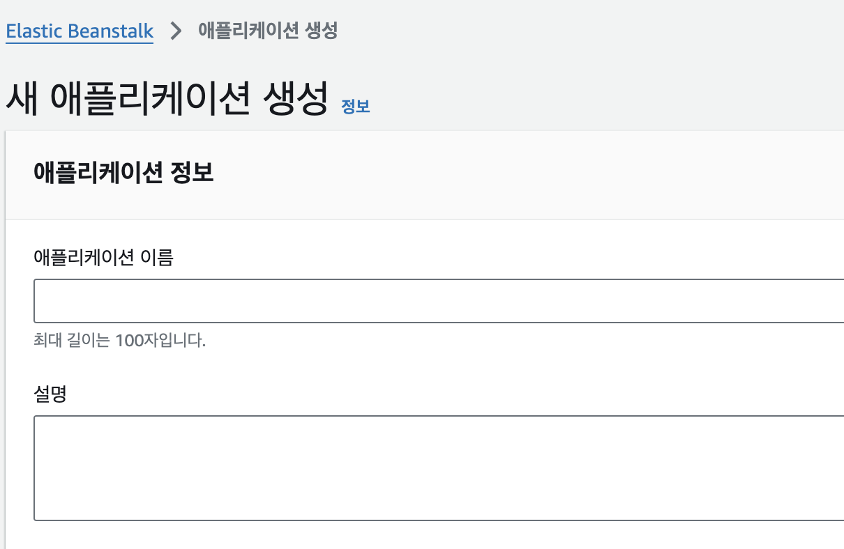 간단하게 이름 입력 후 생성을 누르면 Elastic Beanstalk 애플리케이션이 생성된 것을 확인할 수 있습니다.