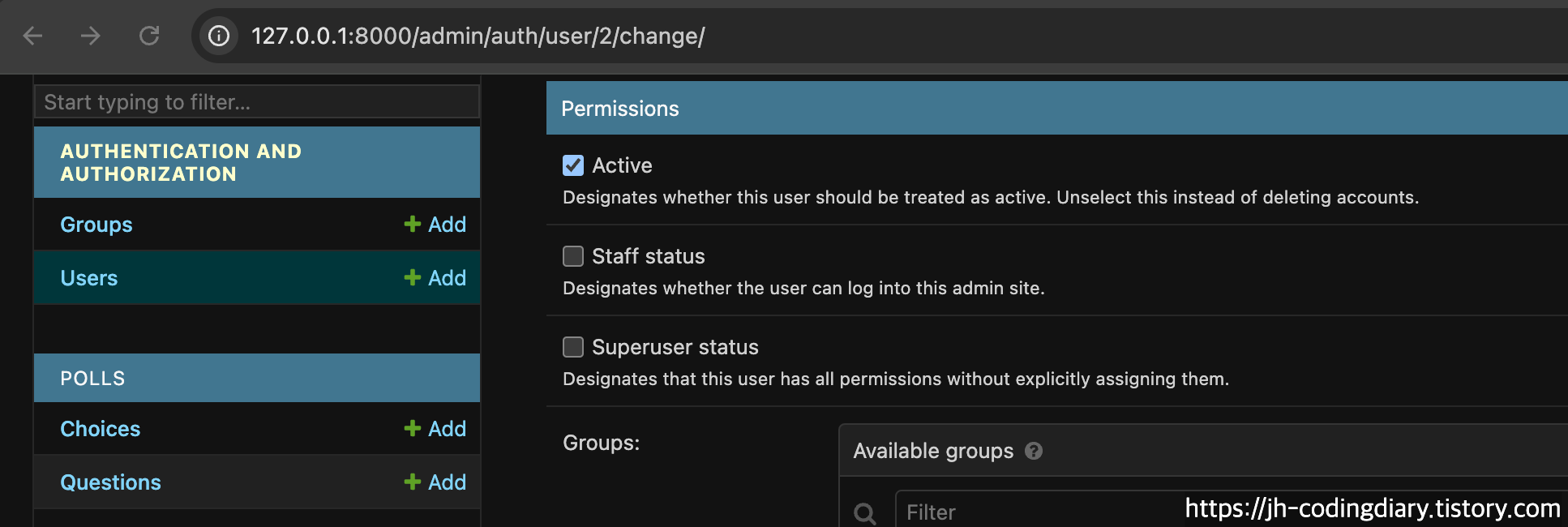 그 중 Permissions라는 항목이 존재하는데요, 저희가 지금 만드려는 것은 Admin이기에 사진에서의 Active가 아닌, Superuser status를 선택한 후 SAVE를 눌러주시면, Admin 계정이 생성된 것을 확인하실 수 있습니다!!