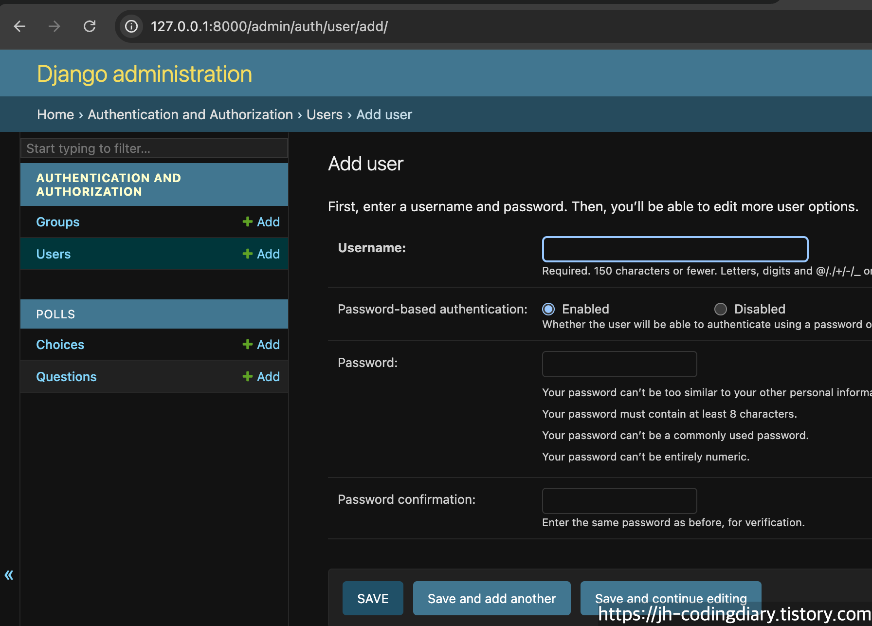 Admin또한 User이기에 Add를 클릭하여 User를 생성해보도록 합시다!