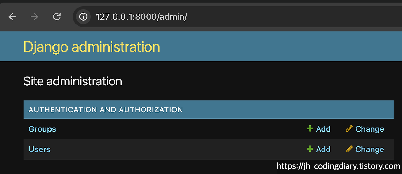 Django 서버를 실행한 후, http://127.0.0.1:8000/admin/에 접근하면, Django의 관리자 페이지를 확인하실 수 있습니다!